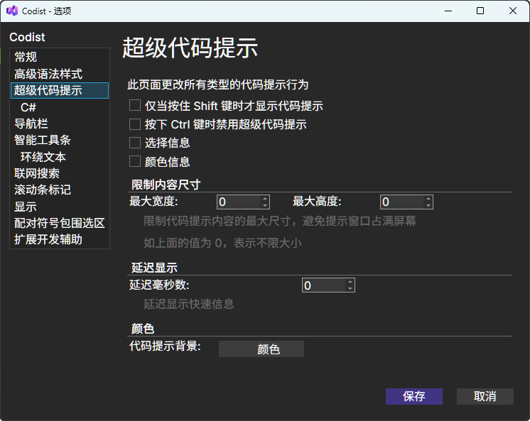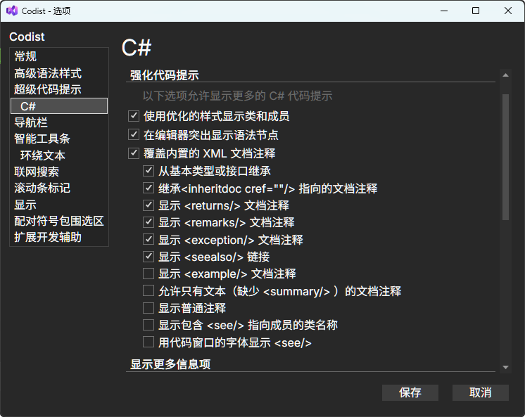 该功能是对快速信息增强功能的详细设置,在显示C#的快速信息时,提供更多的信息。
