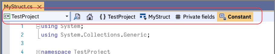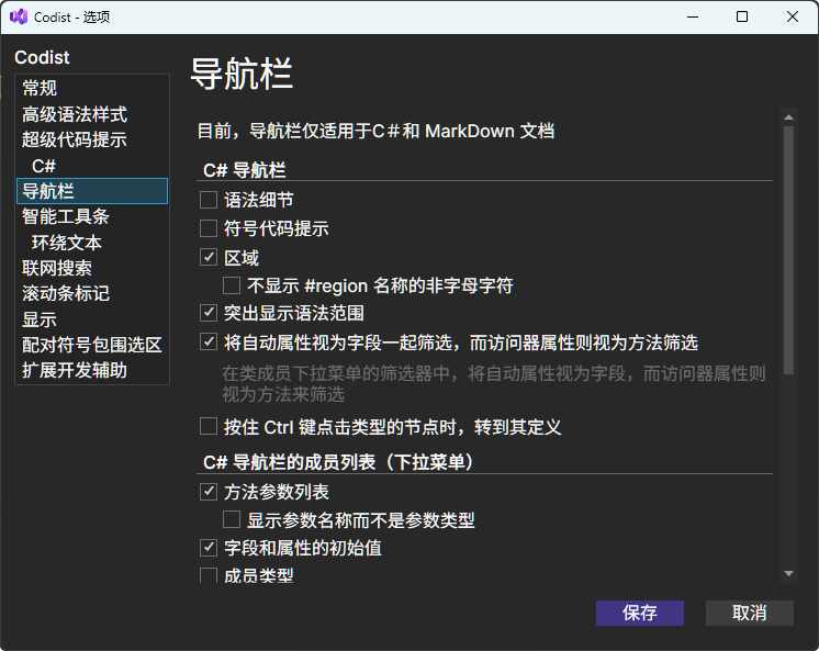 导航栏位于代码编辑器窗口顶部,它会覆盖原有的导航栏。导航栏同时适用于C# 代码文档和Markdown文档。
