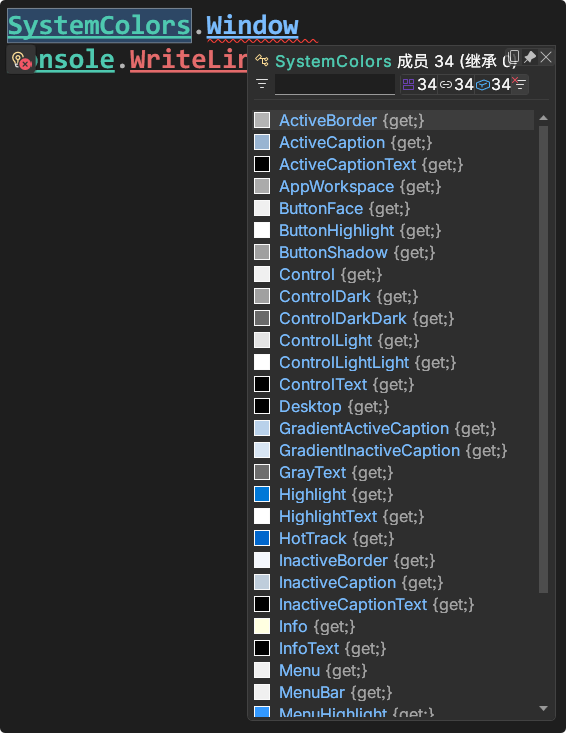 使用「分析-列出成员」可以快速查看颜色类中的定义,比如SystemColors、Colors、Brushes。