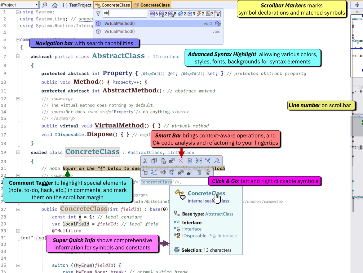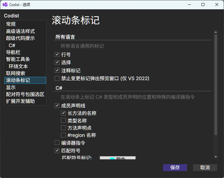 滚动条标记会在垂直滚动条上为一些语法元素绘制额外的形状,如下图中的右侧所示。可以在选项页面更改配置。