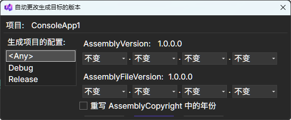 Codist可以在生成项目之前自动更改输出程序集的版本号,选中项目-右键-自动生成版本号设置。